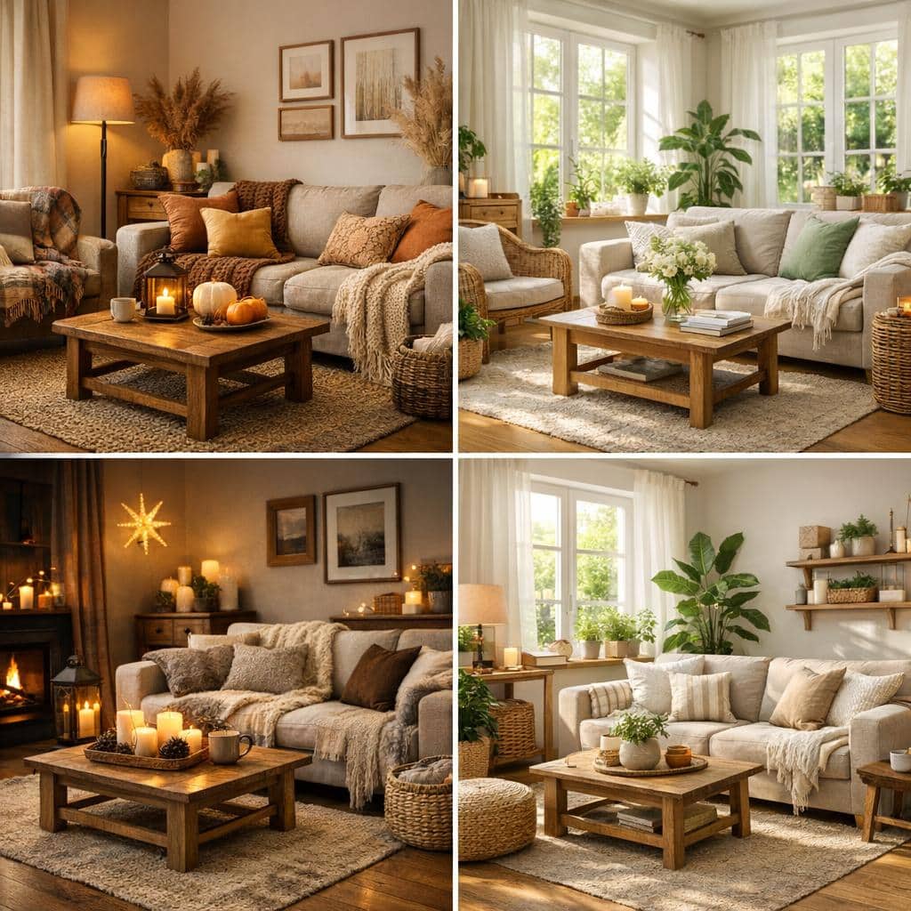 Im Frühling eignen sich florale Muster, helle Farben und frische Blumen. Im Sommer bringen maritime Elemente und leichte Stoffe Urlaubsflair ins Zuhause. Herbstliche Dekoration mit Holz, Kürbissen und warmen Farben schafft Gemütlichkeit.